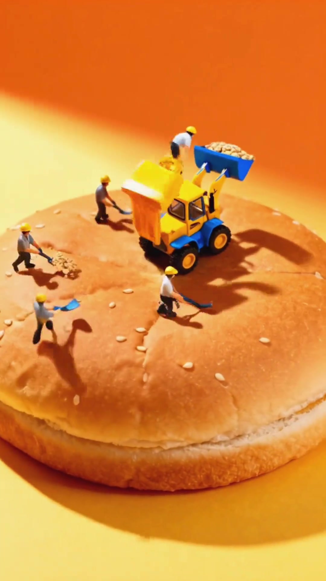 微缩模型创意场景,火山造型的汉堡肉饼,顶