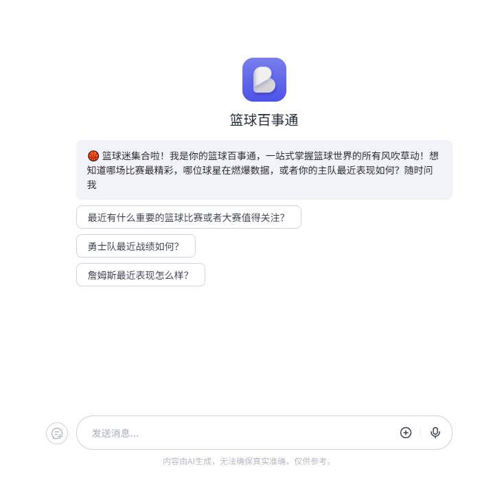 篮球百事通 访问智能体 手机查看 手机扫一扫打开链接 你的篮球圈百事通智能体,实时提供国内外最新篮球比赛资讯、球队动态和球星表现。不管是赛程安排、赛事结果,还是球员技术分析,我都能用专业视角为你一一解读! 智能体, 资讯, 赛程 链接直达
