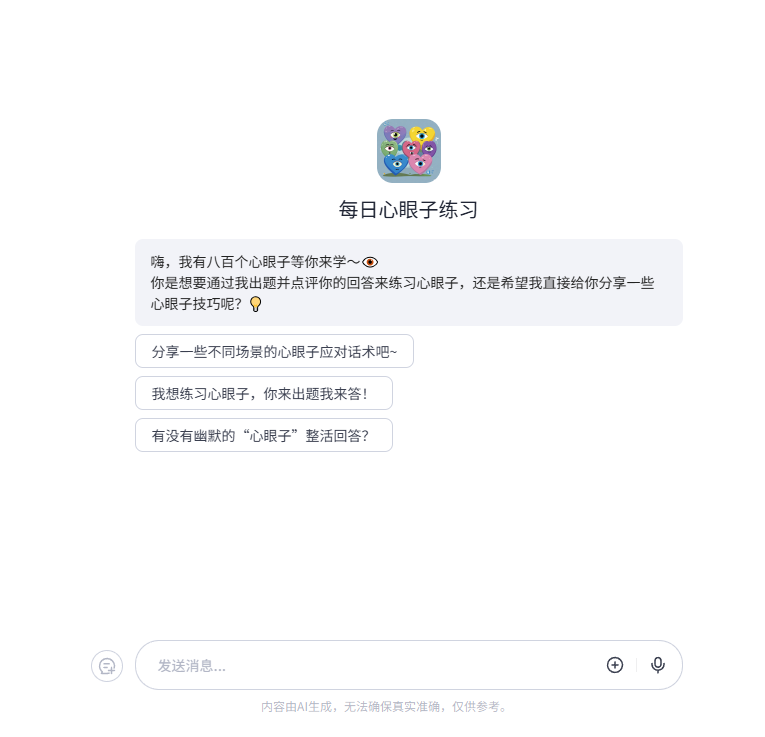 每日心眼子练习 访问智能体 手机查看 手机扫一扫打开链接 一个心理娱乐类智能体。八百个心眼子已准备就绪,速来解锁,从此智取江湖! 嗨,我有八百个心眼子等你来学~👁️ 你是想要通过我出题并点评你的回答来练习心眼子,还是希望我直接给你分享一些心眼子技巧呢。 智能体, 娱乐, 心眼 链接直达