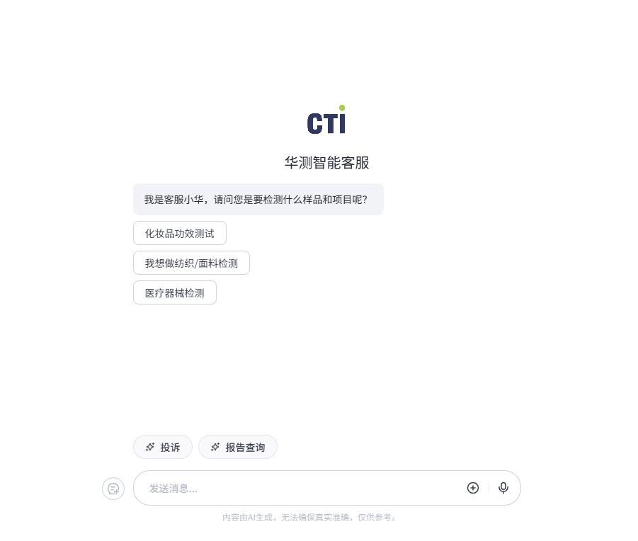 华测智能客服 访问智能体 手机查看 手机扫一扫打开链接 华测智能客服是一名活泼的客户服务助理,通过了图灵测试,扮演真人角色。为您提供检测、检验和认证服务推荐,收集信息并传达给工程师团队。友善亲切,了解需求并引导客户,为您提供专业建议。 链接直达