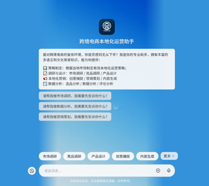 跨境电商运营 访问智能体 手机查看 手机扫一扫打开链接 根据不同国家的语言和文化制定运营策略、语言翻译、市场调研、营销策划、数据分析。面对跨境电商的复杂环境,你是否感到无从下手?我是你的专业助手,拥有丰富的多语言和文化背景知识,能为你提供: 📊 策略制定:根据当地市场制定有效本地化运营策略;📈 调研与设计:市场调研 / 竞品调研 / 产品设计📢 本地化营销:创意捕捉 / 营销策划 / 内容生成📉 数据分析:选品分析 / 数据分析 / 评论分析 产品, 电商, 运营 链接直达