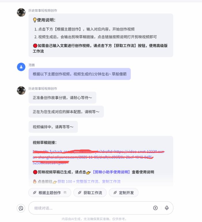 历史故事 访问智能体 手机查看 手机扫一扫打开链接 输入历史故事主题或文案,创作爆款历史故事短视频,生成剪映草稿链接 💡使用说明: 点击下方【根据主题创作】,输入对应内容,开始创作视频 视频生成后,会输出剪映草稿链接,点击链接按照说明打开剪映视频即可 工作流, 视频, 短视频 链接直达