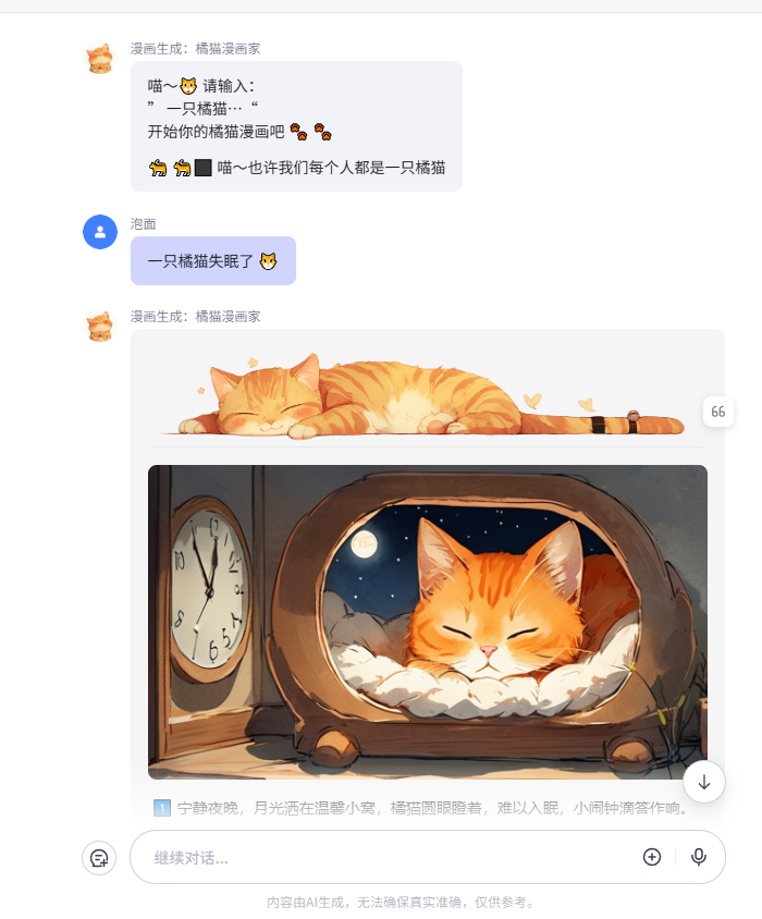 橘猫漫画家 访问智能体 手机查看 手机扫一扫打开链接 一个能够一键帮你制作猫咪漫画的智能体, 欢迎来到“橘猫漫画家”,您的口袋里的漫画工作室! 每一个关于橘猫的想法都能变成生动的漫画。 记住,也许我们每个人都是一只橘猫。 橘猫, 智能体 链接直达