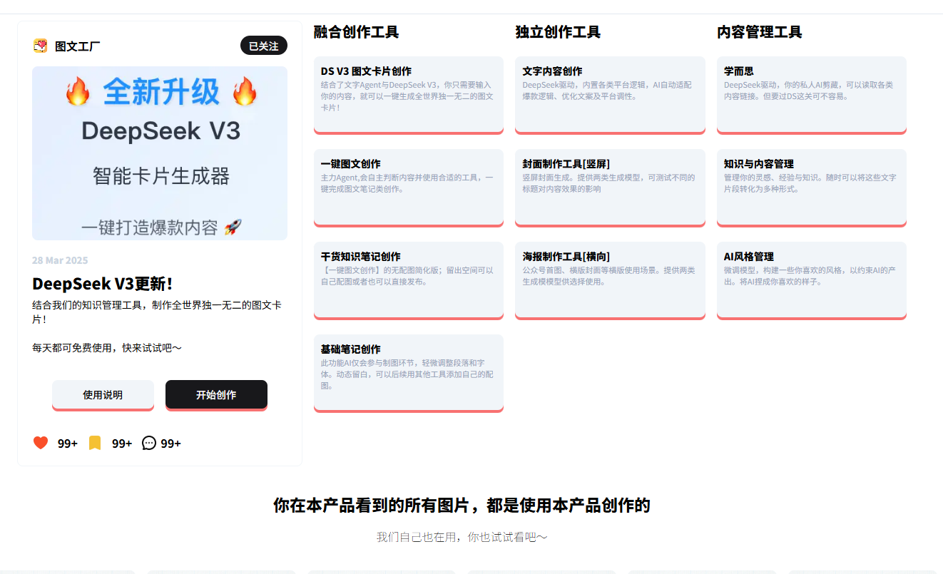 图文工厂 访问智能体 手机查看 手机扫一扫打开链接 图文工厂智能体,DeepSeek V3更新!制作全世界独一无二的图文知识卡片! —————– Hello,很高兴认识你。 你可以用这个产品: -构造属于你自己的个性化AI -构建自己的知识体系 -创作自己的高质量图文内容(小红书、抖音、微信等) -表达确实有时候会比较困难 -因此产品希望AI帮助每个人都有更好的工具去表达自己的思考 -也希望AI能够帮助每个人进行思考与沉淀 希望能够帮助到大家。随时交流~ AI, 工具, 智能体 链接直达