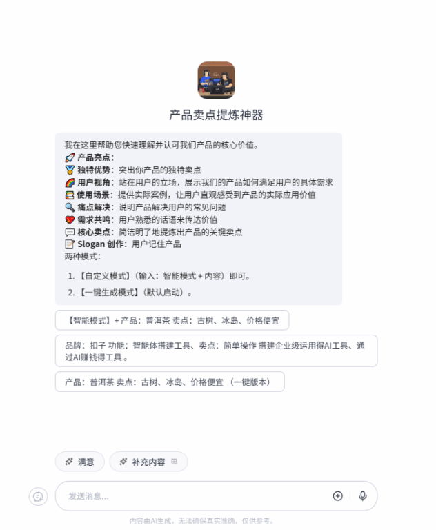 我在这里帮助您快速让产品的核心价值得到用户认可 告诉我你产品的卖点,我来把的你卖点转化我顾客的买点 产品可以是课程、APP、服务 等 商品 我学习的特劳特定位学的所有精华的智能体。