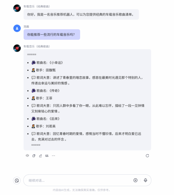 车载音乐(经典歌曲)是一款为用户提供经典车载音乐歌曲清单的对话智能体。通过询问用户的音乐偏好,推荐相应类型的经典车载音乐,让您的驾车更加愉悦。
