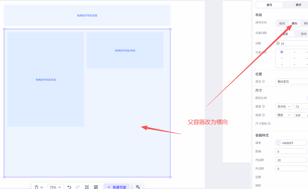 选中「上方容器」(你想把新容器放到它右侧的那个容器)的父容器(就是包裹它的外层容器,可能是页面根容器,也可能是某个分组容器);在右侧的「布局」设置中,找到「排列方式」,把默认的「垂直」改成「水平」;水平排列会让父容器内的所有子容器按「从左到右」顺序排列,这样新容器才能跑到右侧。如下图所示: