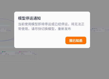 首页 › Coze系列 › Coze扣子模型停运通知当前使用模型即将停运或已经停运? Coze扣子模型停运通知当前使用模型即将停运或已经停运? Coze系列 2026-01-12 239 阅读 0 评论 咱们在使用Coze工作流时候经常碰到这种情况,模型停运通知当前使用模型即将停运或已经停运,将无法正常使用,请尽快切换模型,重新发布如下图所示。这种情况,怎么处理? 首先,要知道,造成这种问题的原因,大多数是大模型,升级了,导致不能使用,这个时候,我们要找到需要更新的大模型节点,平台一般都是用红框,框出来的。如下图所示: 然后,我们选择这个节点,在右侧选择新的大模型就可以了。如下图所示: 最后,发布这个工作流或点击试运行就可以使用了。 标签: 工作流 大模型 Coze 相关文章 coze应用容器搭建,怎么把容器拉到另外一个容器旁边 coze工作流,模型停运通知 怎么解决? 什么是coze扣子工作流? 豆汉会员 怎么把工作流复制/导入到自己Coze空间? 发表回复 取消回复请登录后参与评论...登录 • 注册发布