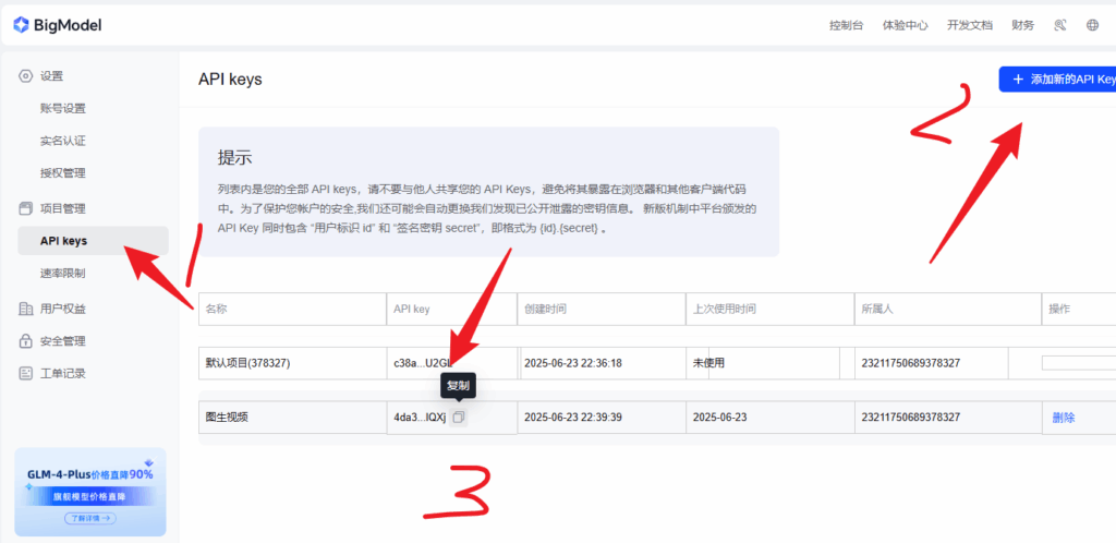 首页 › 业界动态 › 智谱图生视频api秘钥获取教程 智谱图生视频api秘钥获取教程 业界动态 2025-10-31 298 阅读 0 评论 怎么秘钥获取 智谱ai官方 https://www.bigmodel.cn/login?redirect=%2Fconsole%2Foverview 1.完成实名认证 2.创建秘钥并复制 标签: 秘钥 实名 AI 相关文章 提示“无法查看智能体”-进入工作空间、Agent、工作流编排页面时 豆包视频api秘钥获取教程 扣子应用 用户界面模块详细说明 coze怎么发布智能体到企业商店? 发表回复 取消回复请登录后参与评论...登录 • 注册发布