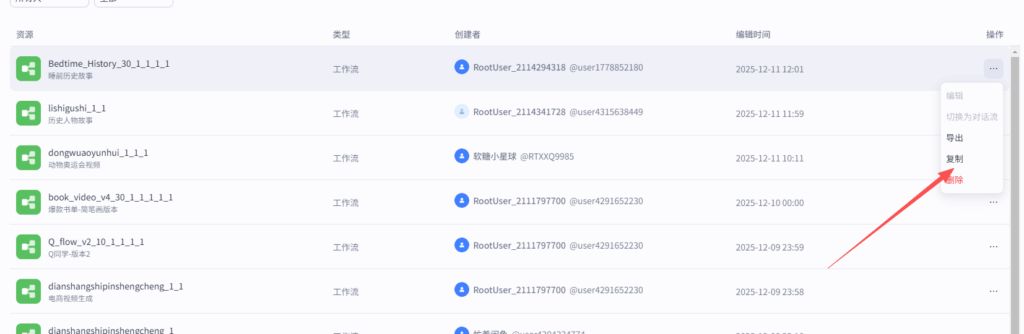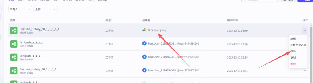 首页 › 经验分享 › 怎么把coze 空间的工作流复制到自己空间? 怎么把coze 空间的工作流复制到自己空间? 经验分享 2025-12-11 317 阅读 0 评论 很多同学,买了工作流或者进入了朋友的共享空间,不知道怎么把工作流复制到自己的空间,很简单哈,只需要3步搞定。 首先,打开扣子开发者中心,进入免共享空间,找到对应工作流,如下图所示。 2、然后,找到操作工作流后面有… 操作列,有个复制按钮,点一下,复制。 3、复制成功后,创建者会显示为你自己,这个时候,就可以导出工作流,然后,再导入到自己空间了。 标签: 空间 开发者 工作流 相关文章 coze应用容器搭建,怎么把容器拉到另外一个容器旁边 扣子应用业务逻辑模块由哪些部分组成 coze工作流,模型停运通知 怎么解决? Coze扣子模型停运通知当前使用模型即将停运或已经停运? 发表回复 取消回复请登录后参与评论...登录 • 注册发布