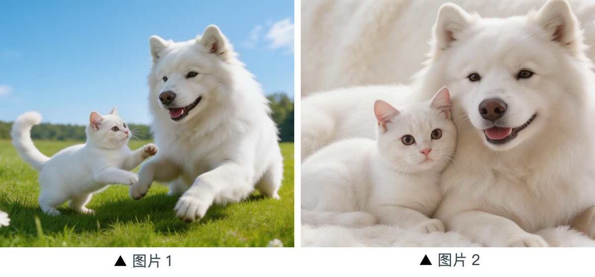 提示词:参考图片中的猫猫和狗狗,在一个温馨的公寓里,狗狗在趴着吃狗粮,猫猫走过来,伸出爪子碰了碰狗狗,狗狗看到猫猫后停下吃饭,猫猫依偎在狗狗身边。画面采用暖色调。