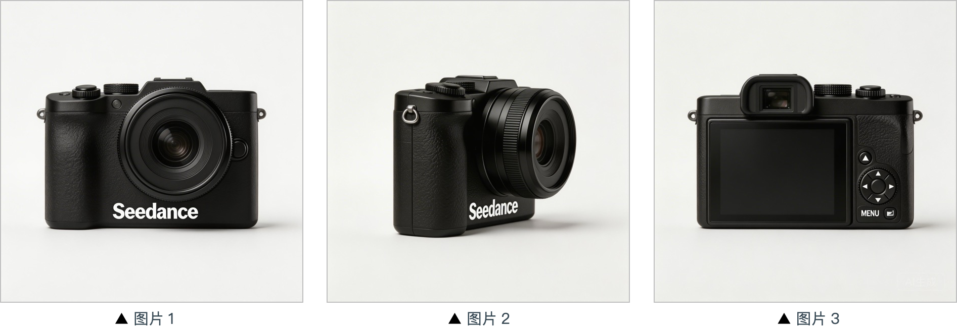 提示词:提取`图片1`、`图片2`、`图片3`的相机,把背景换成白色,相机在一个白色桌子上,镜头以特写的形式聚焦相机,然后以相机为主体缓慢旋转,清晰展示相机的正面侧面以及背面。