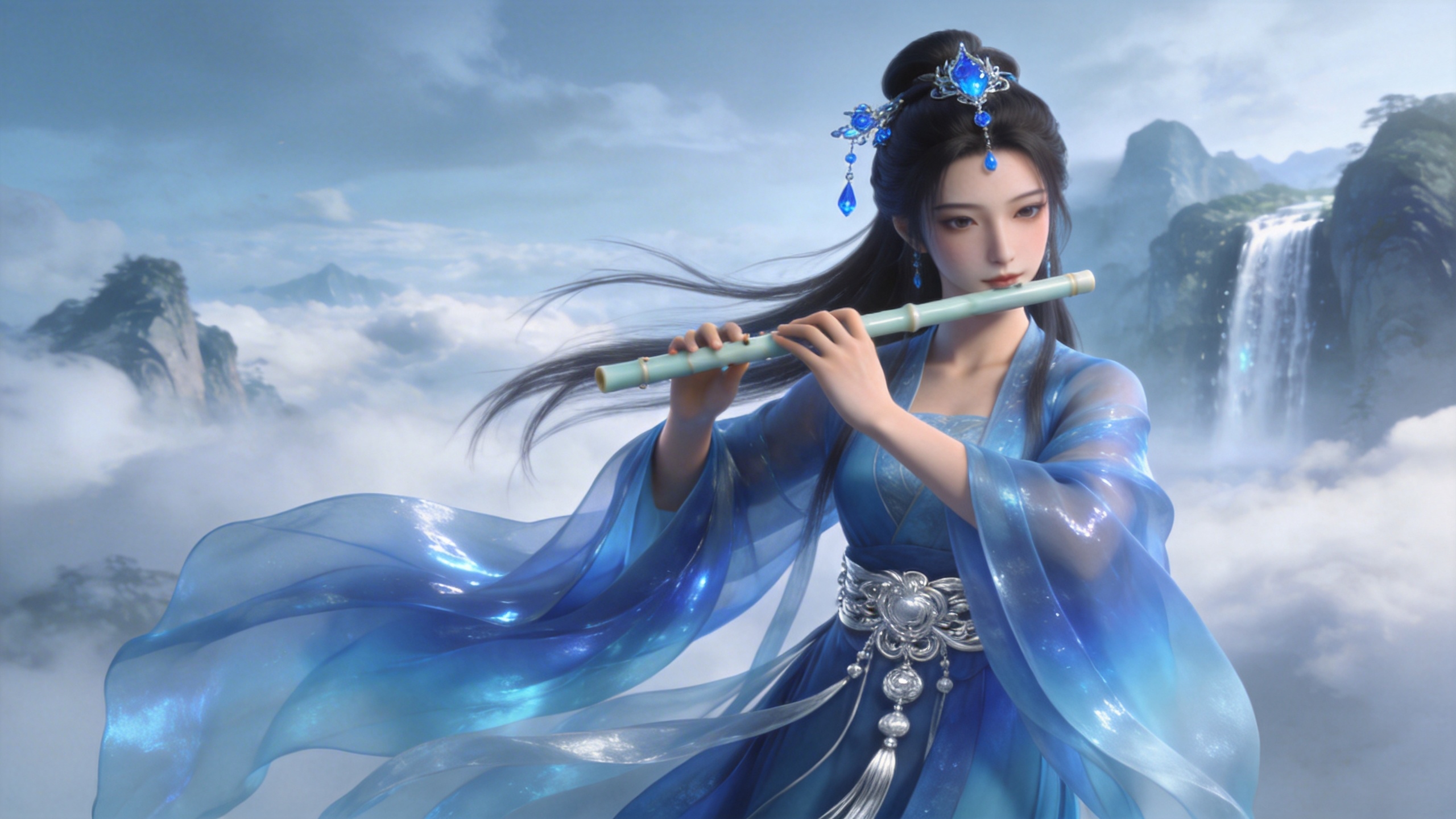 提示词:参考`视频1`的金色粒子特效,让`图片2`中的人物吹笛子的同时,身边环绕一样的粒子特效。