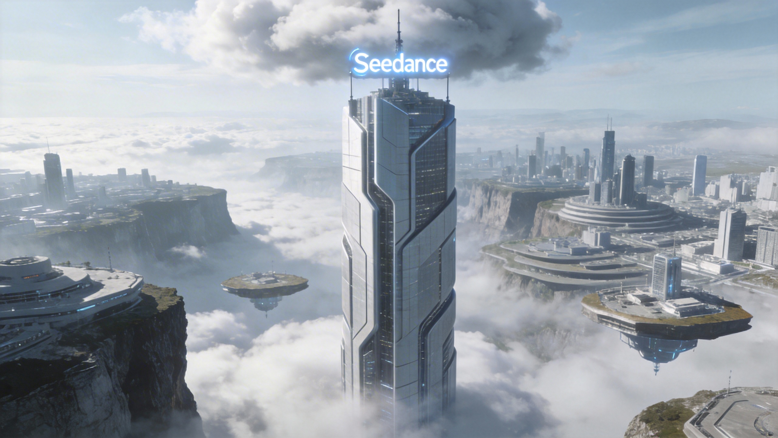 提示词:参考`视频1`的运镜,做一个科技园区的概念视频,以`图片1`中的高楼为视觉中心,同为第一视角俯冲,体现出`图片1`中园区的科技感。